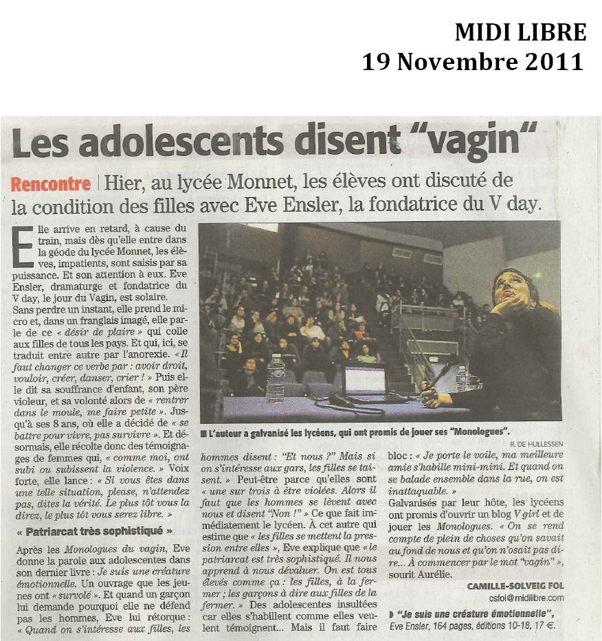 In October, V-Day and MCR Productions brought V-Girls to France for thevery first time through curated workshop productions of Emotional Creature at Ciné 13 Théâtre. The sold-out performances were hugely successful and paved the way for the launch of the French translation of Eve Ensler's bestselling book I Am An Emotional Creature: The Secret Life Of Girls Around The World.