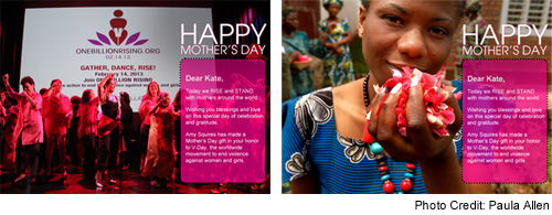 Celebrate Mother's Day by supporting the global movement to end violence against women and girls. NEW this year, V-Day is offering two Mother's Day V-Card designs to chose from. Make a donation to V-Day on behalf of your mother, friends, and loved ones, and V-Day will send the specially designed 2012 Mother's Day V-Card of your choice letting them know of their unique gift in their honor.